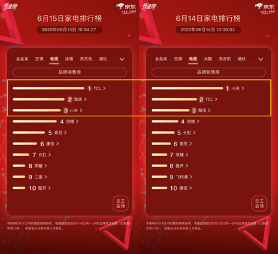 最引人瞩目的榜单当然还是少不了电视。小米电视是否还能连任昔日的霸主地位成为今年618的一个未解之谜。自6月1日京东618开启至今,电视品牌中不断涌出新的挑战者,小米的处境的确很危险。今日榜单小米再次被TCL所超越,这已经是TCL的第二次争夺榜首。更遗憾的是,紧随TCL其后的海信同样超越了小米排在第二名,小米滑落到了第三名。唉,今年的小米可真的是太难了!日夜防守却还是没防住。不过,目前作为登上榜首次数最多的小米,还是十分有可能继续夺冠的,最后的3天可得好好把握住机会呀!