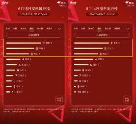 今天是6月15日,距离京东618的“准日子”仅剩倒计时3天的时间。而这3天也将是各大家电品牌在京东家电618竞速榜上争取排名的最后机会!毋庸置疑,现在已经到了厮杀最激烈的时候,我们先一起来看看今日榜单的变化。