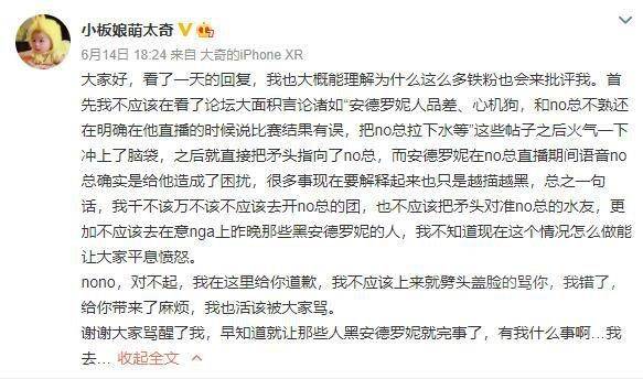 而他老婆板娘在冷静下来之后,也对自己的不当发言表示抱歉,当时发出这些过激言论,也是被nga的一些帖子刺激到了,火气上头才会发出这些内容,同时也对no总表示道歉,自己不应当掺和进来。