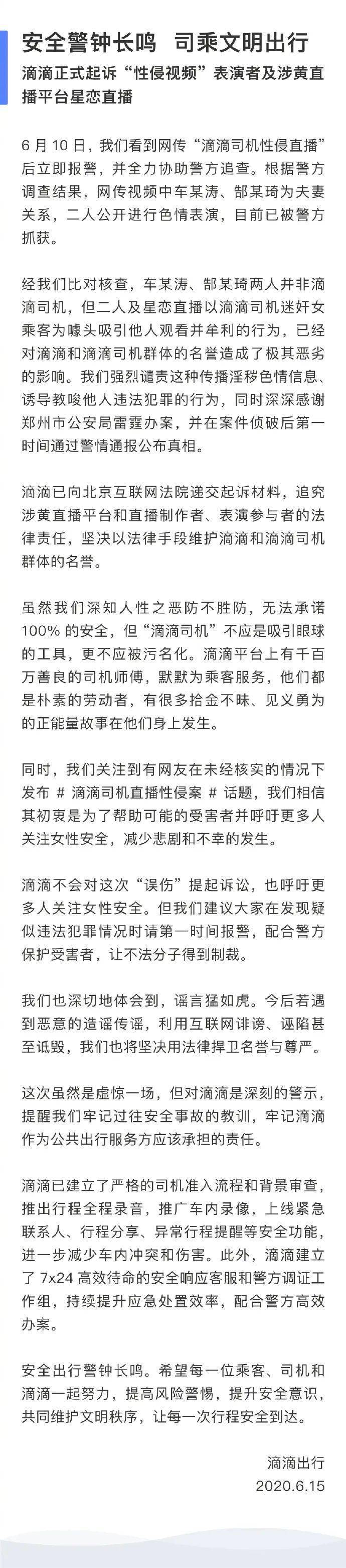 原标题:滴滴声明:正式起诉“性侵视频”表演者及涉黄直播平台星恋直播