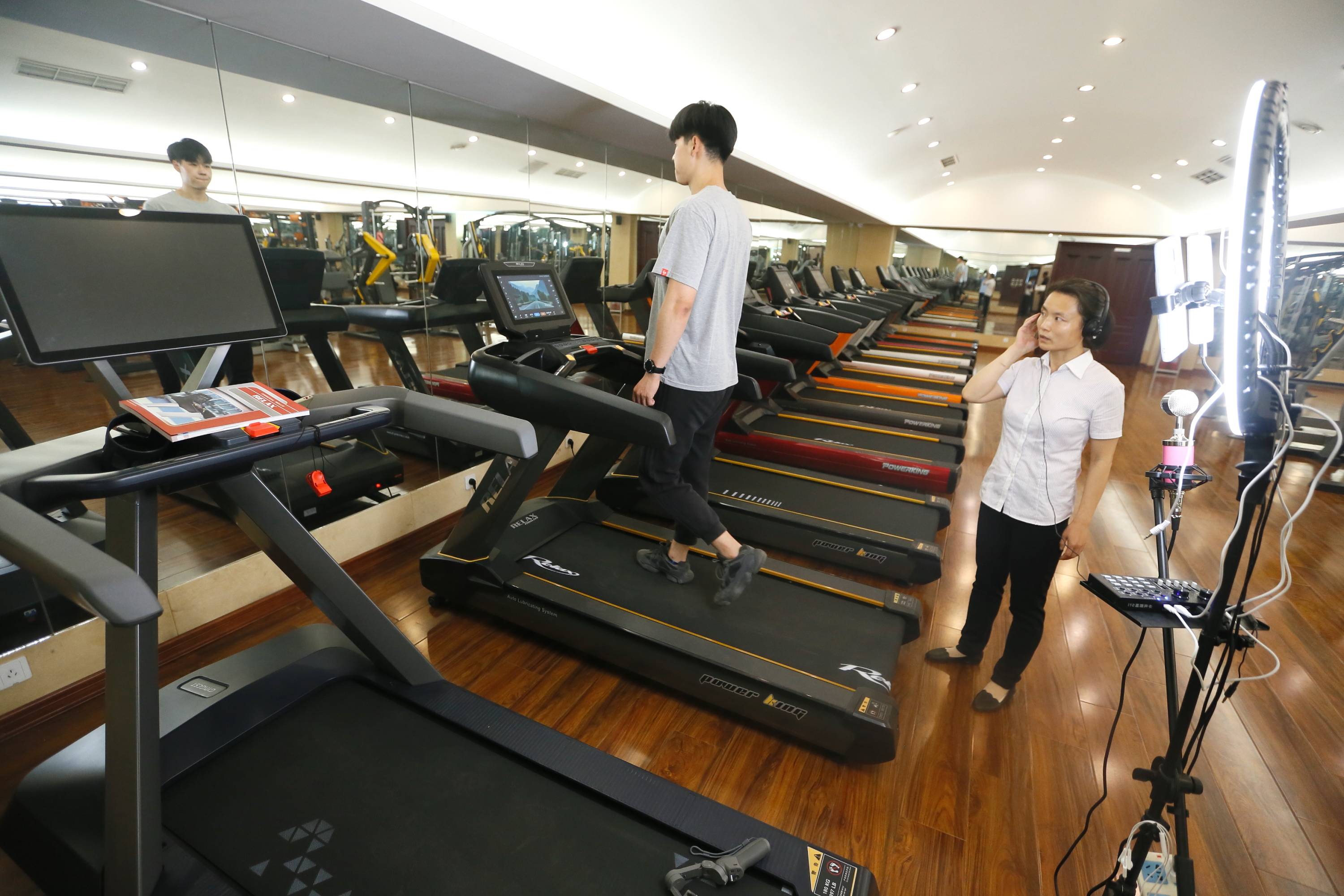 6月15日,在位于山东省青岛市即墨区的青岛英吉多健康产业有限公司,营销人员通过广交会直播平台推介出口海外市场的健身器材产品。