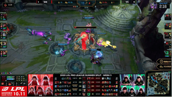 双方阵容:VG的阵容偏向前期的强势,前期的各个位置都非常的舒服,而WE则被ban了4个中单后选择了卡牌这个六级游走的英雄,但WE的阵容更偏向后期团战一些!