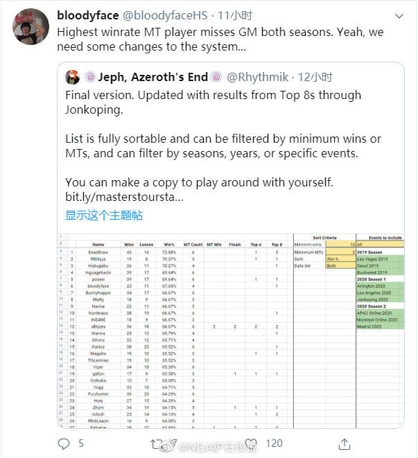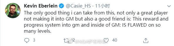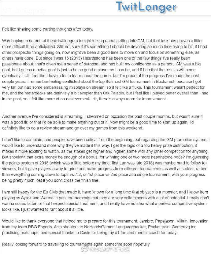 昨日凌晨DeadDraw在延雪平大师巡回赛半决赛中惨遭淘汰,因而错失了晋级特级大师的资格。虽然他在六场巡回赛中以43-16的总成绩,胜率排名第一,但由于所获奖金总额被卡在两赛季结算之间而未能保送GM。比赛结束后欧美职业圈无不为这位高胜率选手感到惋惜。他也发长推回顾了自己的参赛经历和对现行赛制的一些看法,表示自己将尝试进行更稳定的直播。