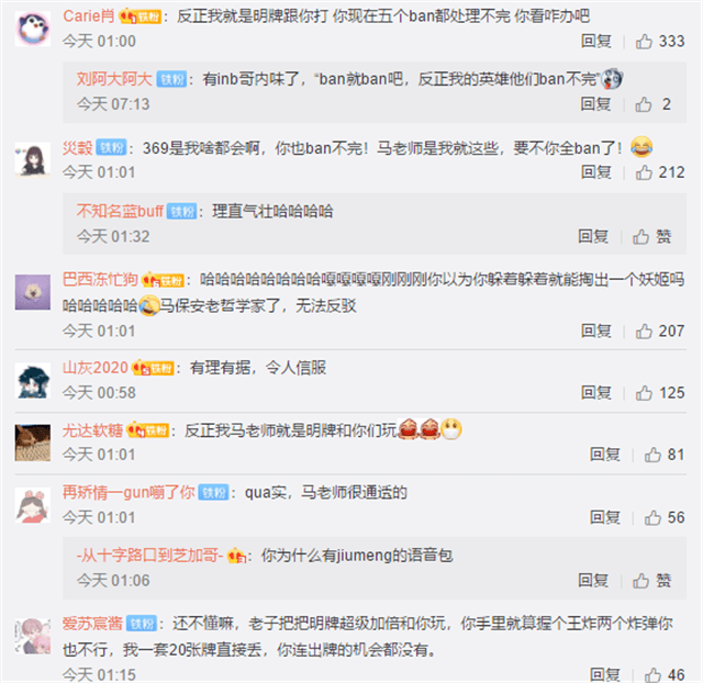 还有粉丝调侃说,马老师直接明牌跟对面打,等到五个ban都处理不完的时候,看他们怎么办。跟他相似的选手还有fpx战队的金咕咕,以及tes战队的369,他还经常选择一些粉丝没有想到的英雄。