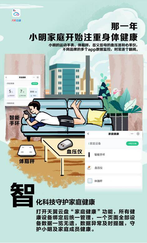 此外,就家庭健康而言,未来,天翼云盘家庭场景将面向多种健康检测设备提供标准接口,只需一个APP,就可以自动采集,综合分析所有设备的健康数据,即可实现家庭成员间数据互通、健康数据报告呈现、异常数据及时预警等多项功能。