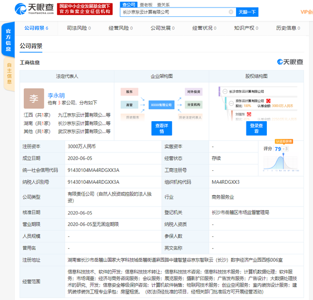 6月16日上午消息,天眼查数据显示,近日,长沙京东云计算有限公司成立,该公司注册资本3000万人民币,法定代表人为李永明,公司经营范围包括大数据处理技术的研究、开发;信息安全等级保护咨询;物联网技术服务;信息科技技术、软件的开发;信息科技技术转让;信息科技技术咨询等,由京东云计算有限公司全资持股,后者的最大股东为刘强东。