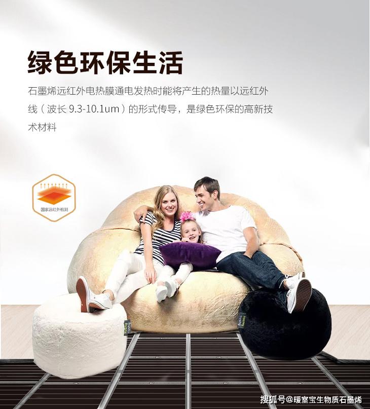 新型材料生物质石墨烯的发热原理为生物质石墨烯发热芯片在通电以后,其碳原子在电流的作用下,产生“布朗运动”。碳原子之间发生剧烈的摩擦和撞击,由此产生的热能以远红外辐射和对流的形式对外传递,从而达到取暖的目的。远红外光波被称为“生命光波”,对人体具有生理活化作用,可以让家居采暖更健康更舒适!