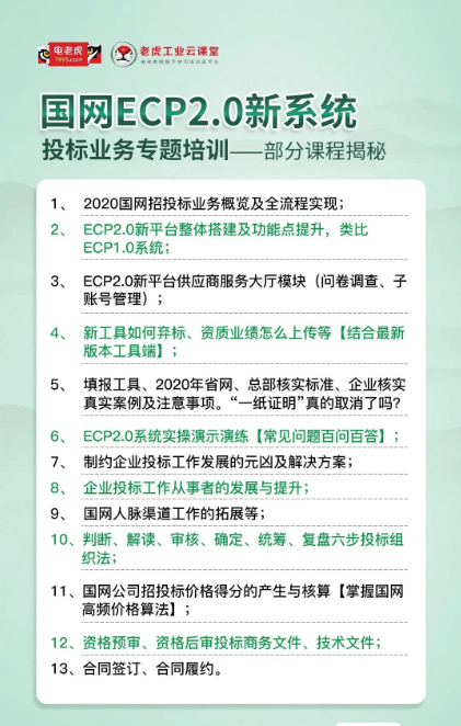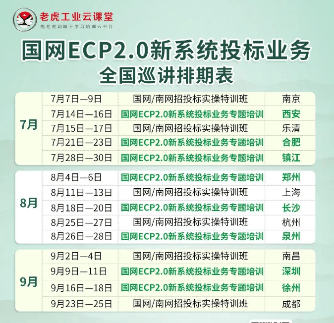 为确保各供应商高效迅速地开展投标工作,电老虎网旗下专业工业学习培训平台老虎工业云课堂近期将在多个城市举办《国网ECP2.0新系统投标业务专题培训》,重点讲解国网ECP2.0平台功能应用、招投标全流程、废标案例分析、标书编制等,欢迎报名参加!