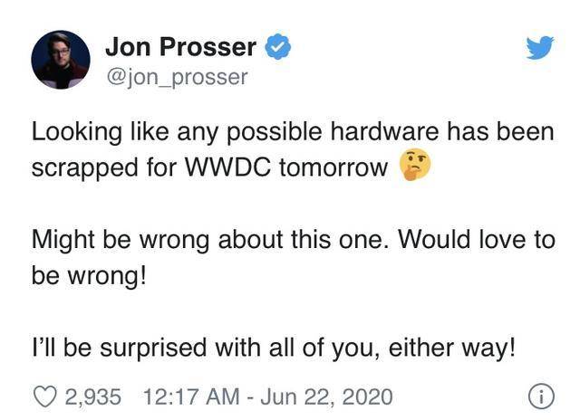 据乔恩表示:明晚的WWDC 2020发布会上将不会有全新硬件产品推出。