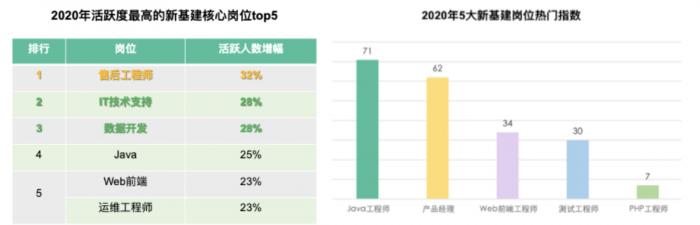 随着各地新基建计划的出台,人才需求仍在不断攀升:5月,新基建直接相关行业招聘需求增长178%,招聘岗位数量是2月招聘总量的2.8倍。招聘需求多集中在技术研发,其中,IT技术支持岗位需求增幅最大,达42%。