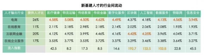 从新基建人才的供给来看,电商、互联网金融、在线教育、在线企业服务是为新基建输送人才最多的四大行业。其中,26%新基建流入人才来自电商行业,电商成为新基建人才最大的“孵化场”。