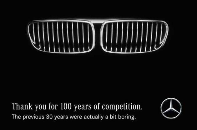 无论是戴姆勒前任首席执行官蔡澈博士退休时宝马放送的“蔡澈终于可以开自己喜爱的宝马了”的广告,还是宝马建厂一百周年时戴姆勒祝贺的“你们终于100周年了”的调侃,双方之间的一时“瑜亮”情节,人尽皆知。