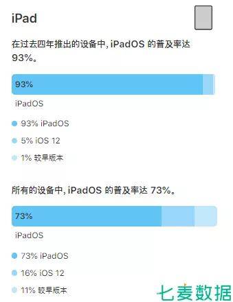 所有 iPad 设备中,iPadOS 的安装普及率已高达 73%,iOS12 的安装使用率已降至 16%。