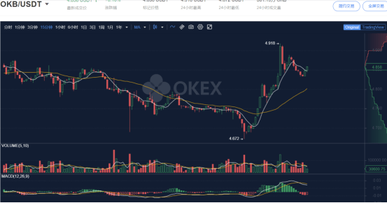 今日周一开盘,OKB行情开启快速的拉升,在4.627USDT位置开启上升行情,短时间内快速拉升,最高触达4.918USDT,涨幅高达6.29%。