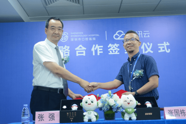 深圳市口腔医院院长张强(左)与腾讯智慧医疗总经理(右)签署合作
