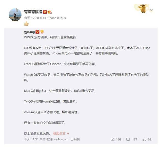 而临近发布会,就已经有博主爆出苹果今年的WWDC 2020的最新内存了,该博主称今年的WWDC没有新硬件发布,而只有苹果的OS系统的全家桶更新。