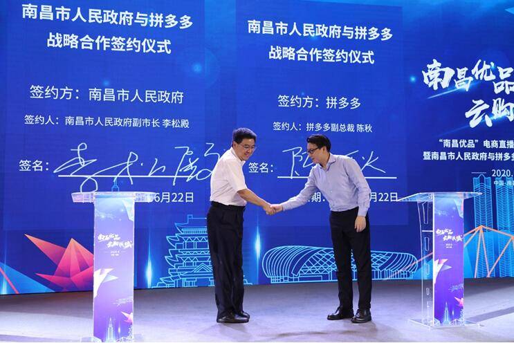 6月22日,南昌市人民政府与新电商平台拼多多签订战略框架协议,共同启动“南昌优品”电商直播消费节、“南昌优品馆”线上大型展销专场等系列活动。