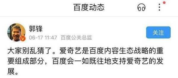 事情发酵一天后,6月17日,在百度APP上实名认证为百度公关总监的郭锋发文回应称,“大家别乱猜了。爱奇艺是百度内容生态战略的重要组成部分,百度会一如既往地支持爱奇艺的发展。”不过遗憾的是,根据这一回应,我们无法得出更多有效的信息。