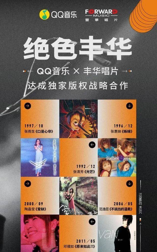 6月22日,腾讯音乐娱乐集团与丰华唱片达成了战略合作。丰华唱片的正版音源已登陆腾讯音乐娱乐集团旗下QQ音乐、酷狗音乐、酷我音乐、全民K歌四大平台。丰华唱片成立于1995年,20余年来为华语乐坛输送了无数金曲,其中包括让张惠妹红及全亚洲的《姐妹》专辑、张雨生的最后一张专辑《口是心非》等作品。本次合作也涵盖了可登、大声、野火、娱乐等数个音乐厂牌的版权内容,用户可以在TME再次回味蔡琴、罗文、汪明荃、郑少秋等歌星的代表作。