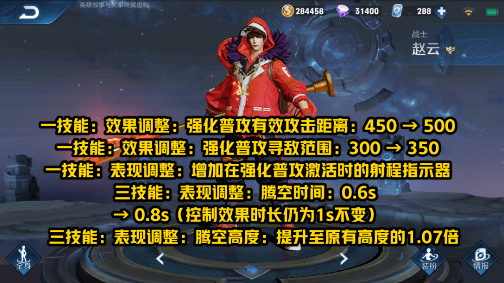 第三个就是赵云了,从上图可以看出,一技能的强化普攻范围是增加了一点,可以打到更远的敌人了,而三技能腾空虽然提升到原有的1.07倍了,但是时长也是增加了0.2秒,控制效果不变,可以说是加强了一点吧!