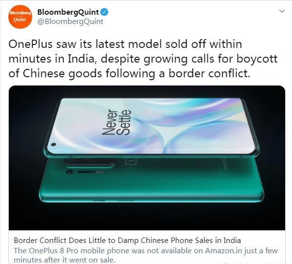 据了解,中国的智能手机制造商一加科技的最新款手机一加8 Pro,6月18日在印度市场开卖几分钟之内就被抢购一空,甚至还有印度消费者抱怨到“等了几天还是没有抢到”,而据印媒表示,该款手机在印度市场的需求量很大,中国公司也正在努力确保该设备能够持续供应。