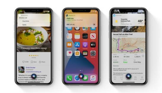 Siri 也在 iOS 14 中得到升级,现在唤醒 Siri 不再占用整个屏幕画面,新 Siri 采用全新悬浮显示设计,唤醒使用时不会遮挡其他页面。得益于强大的翻译系统,Siri 现在支持更多国家的语言了,并且支持了更快速的识别语言和实时翻译功能。从演示视频中可以看到,Siri 的识别速度变的极快,基本可以做到瞬间回答和操作。