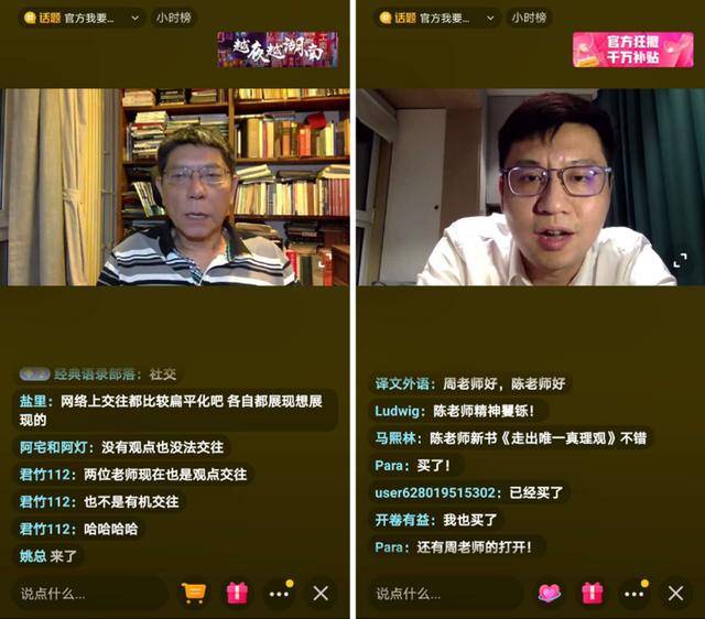 比如抖音近期联合混沌大学共同推出的"抖是创造者"计划,就集结了诸多互联网旗帜性人物及文化学者、CEO等各领域大咖,为万千网友打造一场超级思想峰会。在本周6月18日,首都师范大学哲学系教授、著名哲学家陈嘉映以及中国人民大学哲学院教授、知名学者周濂共同来到抖音直播间就《在立场极化的今天如何说理》这一主题进行了哲学领域的深度探讨。