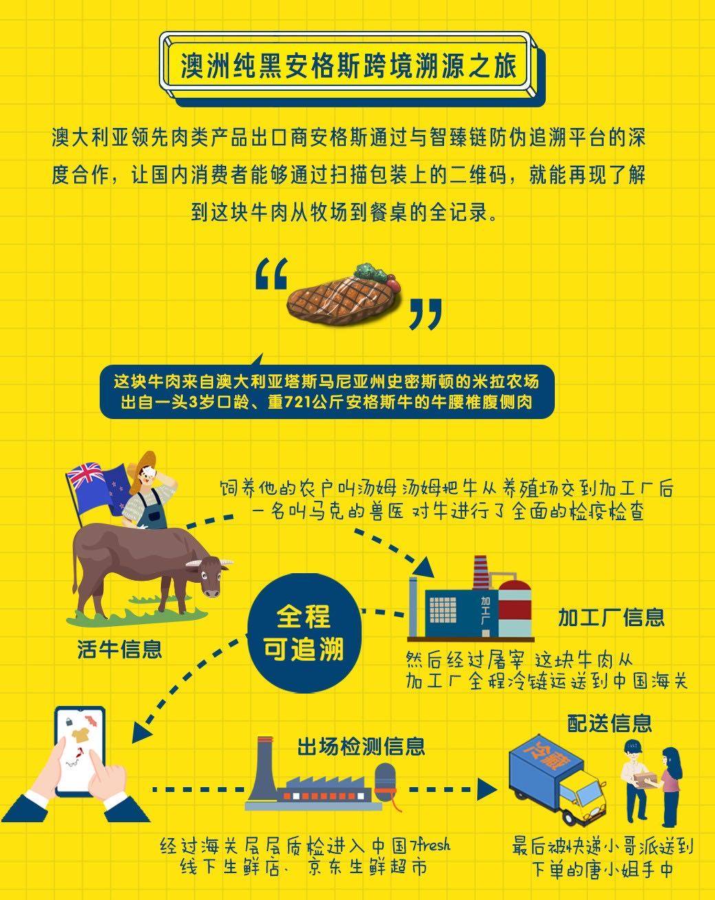 比如在河北省武邑县与京东合作成立的“跑步鸡乐园”中,每一只鸡的脚上都会戴上二维码溯源脚环,成为小鸡们唯一的身份识别。在跑步鸡出栏后,通过加工、物流等环节直至消费者购买,消费者通过扫码,就能看到养殖场在饲养过程的状态,如位于哪个养殖场,养殖人员是谁,这只鸡吃的食料是什么等。大连鑫玉龙则通过与京东数科区块链的“千里眼”视频手段,将海参的“育种-育苗-养殖-加工”各阶段生产信息都加入到了追溯中,全程透明可追溯。而在跨境食品方面,京东与澳大利亚肉类产品出口商InterAgri合作,澳洲优质的纯黑安格斯牛肉进入中国市场,也有了区块链溯源方面的品质保障,确保每一块纯黑安格斯牛肉从草原到餐桌的各个环节都“记录在案”。