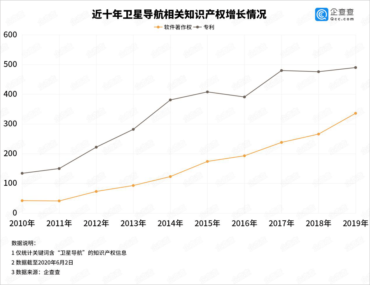 据企查查数据显示,近十年卫星导航相关软件著作权和专利注册量呈直线上升趋势,截至2020年6月,卫星导航相关软件著作权和专利数量分别达1600条和4000条。