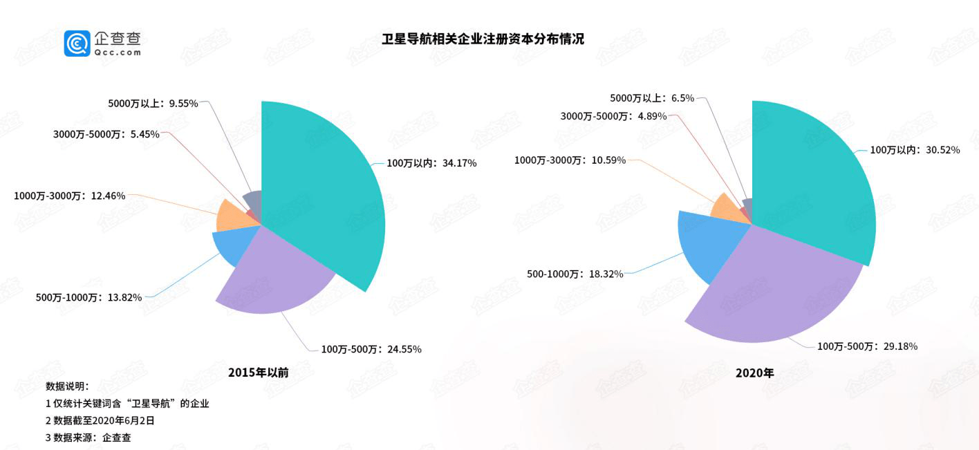 由于受卫星导航政策红利、我国卫星导航技术和系统日益成熟、服务性能逐渐提升,应用领域愈发广阔,市场看好整个行业的发展前景,据企查查数据显示,对比2015年前后卫星导航相关企业的注册资本,发现100万以内注册资本比例降低,从34.37%降至30.52%,100万-500万注册资本比例上升,从之前的24.55%上升至29.18%。