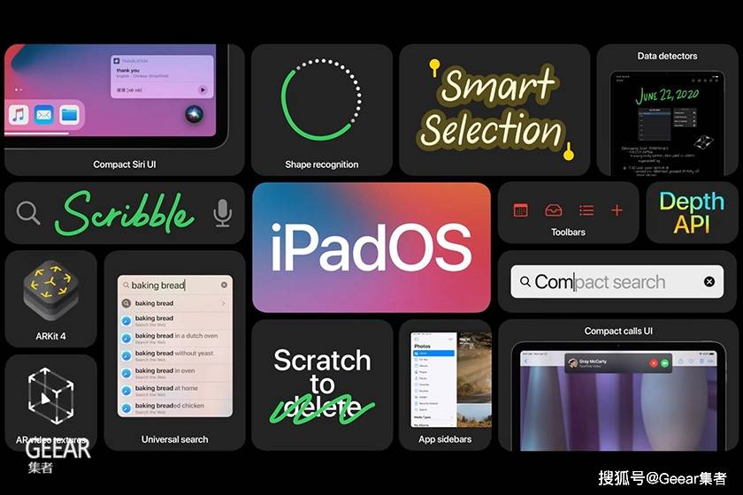 全新 iPadOS 最大的改变必定是新增了「Scribble」功能,可以在任何文字框内直接以手写字自动转换为文字,除了英文外也能识别中文字。iPad 的「Search」功能也重新设计成变得更通用,随时随地可以在任何 App 或画面上,启动搜寻需要的东西。「Photos」也被调整得跟 Mac 版本的设计相似,有着新的侧边栏。以 iPad 手绘图形时,在收笔前稍微停留一下,就会自动转成电脑绘图图案。