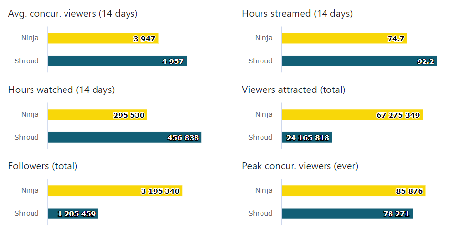 也就是说,只有15%和27%的用户跟着Shroud和Ninja来到了Mixer上。对于花了近一亿美元「转会费」的微软来说,这个数字并不能让他们开心。此外,据Twitch tracker的数据显示,在最近的14天里,Ninja直播间的平均最高同时在线用户数仅为3947人,而Shroud也只有4957人。