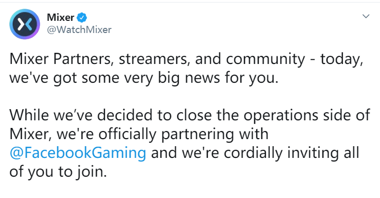 「我们决定停止Mixer平台的运营,并且邀请所有在Mixer直播的朋友转到我们的新合作伙伴Facebook Gaming,继续自己的直播生涯。」Mixer官方如此表示。