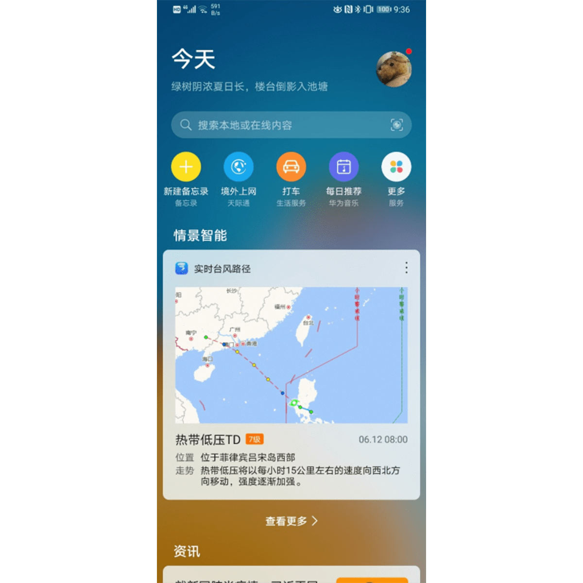 华为智慧助手·今天作为你的贴心助理,在多台风季,实时呈现台风的动态实况,用户只需右滑主屏即可查看。当用户所在地的气象台发出台风预警时,智慧服务会生成一张卡片,呈现台风的实时动态信息,包括台风生成、实时更新台风路径、到台风消失,一方面用户依据情况安排好出行,另一方面让受影响区域的用户及时防灾,减少损失。