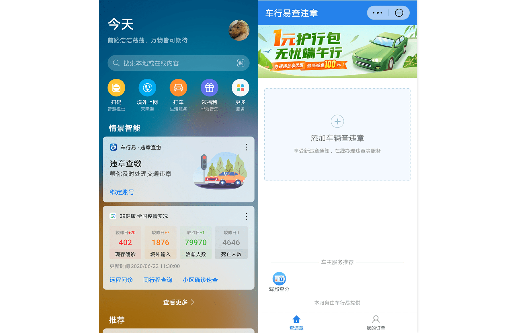 此外,即日起至2020年6月24日,还可购买1元护行包服务,用于端午假期出行违章产生的罚金减免,点击智慧助手·今天右上角头像,进入“我的”界面;点击“情景智能”>“车行易查违章”>进入服务,点击顶部活动即可购买并使用。