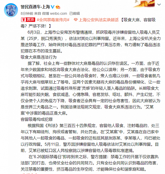 据上海市公安局官方微博消息,6月3日,上海市公安局发布警情通报,抓获吸毒并涉嫌容留他人吸毒人员艾某(25岁,脱口秀演员),依法对其处以刑事拘留。近年来,上海公安机关全力推进禁毒工作,始终保持对毒品违法犯罪的严打高压态势,有力遏制了毒品违法犯罪在本市的滋生蔓延。