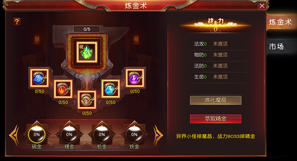 玩家135级开启炼金术系统,可通过进入战力BOSS击杀不同层数的战力小怪,获得炼金材料,将炼金材料炼制为精金,可提升基础属性和战力。