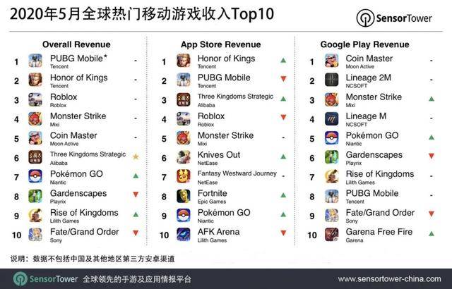 原标题:5月全球移动游戏收入排行:腾讯《PUBG》《王者荣耀》前二