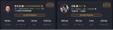 而从数据上来看,汪峰不愧是歌坛里的成名老将,在直播的热度以及直播的活跃度上要远比现在直播圈为首的老罗有着更高的音浪值以及近乎一倍的累计观看人数,可谓是顶起了当日抖音#直播秒杀狂欢节#的流量支柱!