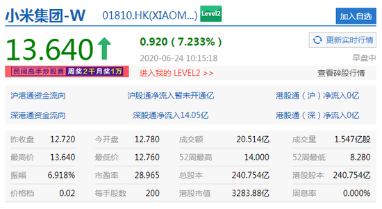 6月24日上午消息,6月23日晚间, 小米宣布回购不超过公司10%的股份,或涉资305亿港元成历年回购之最。受此影响,截至发稿,小米集团涨7.23%报13.64港元,成交量1.547亿股,涉资20.514亿港元。按当前价计算,市值为3283.88亿港元。
