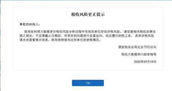 还有公司在登陆税务局网站时,窗口弹出提示:“我局在利用大数据进行税收风险分析过程中发现你存在涉税风险,请依据相关规定,对存在的问题进行自查自纠,我局将持续关注你单位的纳税情况。”