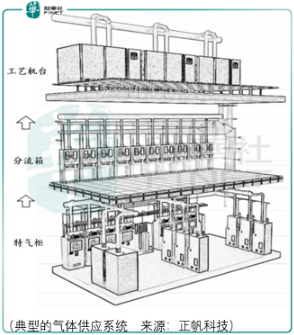 以气体供应系统为例,其对应典型的工艺介质有砷烷、硅烷、四氯化硅、氢氟酸、三甲基铝,这些工艺介质分别应用于集成电路的掺杂工艺、化学气相沉积工艺、晶圆清洗与刻蚀工艺、电池背纯化工艺之中。