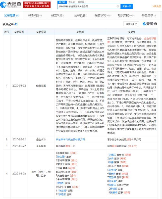北京商报讯(记者 孟凡霞 宋亦桐)金融科技巨头京东数字科技控股有限公司(以下简称“京东数科”)又完成了一次重要的人事变动。6月23日,据天眼查最新数据显示,6月22日,京东数科发生多项工商变更,京东CHO(首席人力资源官)余睿卸任公司董事长,由刘强东接任。
