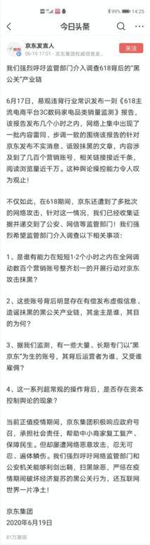 当然,京东也不是吃素的,赶紧祭出一则声明,强烈呼吁监管部门介入调查618背后的"黑公关"产业链。
