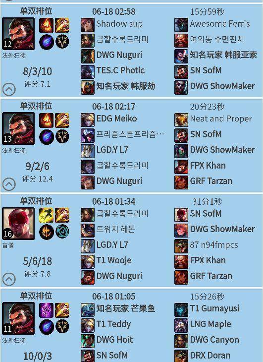 看到黑科技打野点燃男枪后,小编不禁去韩服看了一下最近打野男枪都是什么路数,发现LPL赛区SN战队的sofm选手十分钟爱点燃男枪,战绩也是一页飘蓝,KDA竟高达两位数!sofm不禁开发了点燃男枪,还开发了一手传送男枪!