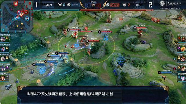 在双方的第四局比赛当中,RNG.M选出了当前版本非常强势的打野镜,而DYG给出的答案则是使用冷门英雄女娲来干扰镜的移形换位,并为队友拉扯输出空间,毕竟她的二技能可以卡住位置,而一技能还可以推开镜。这也是时隔472天近两年的时间后,女娲再度登上职业赛场。