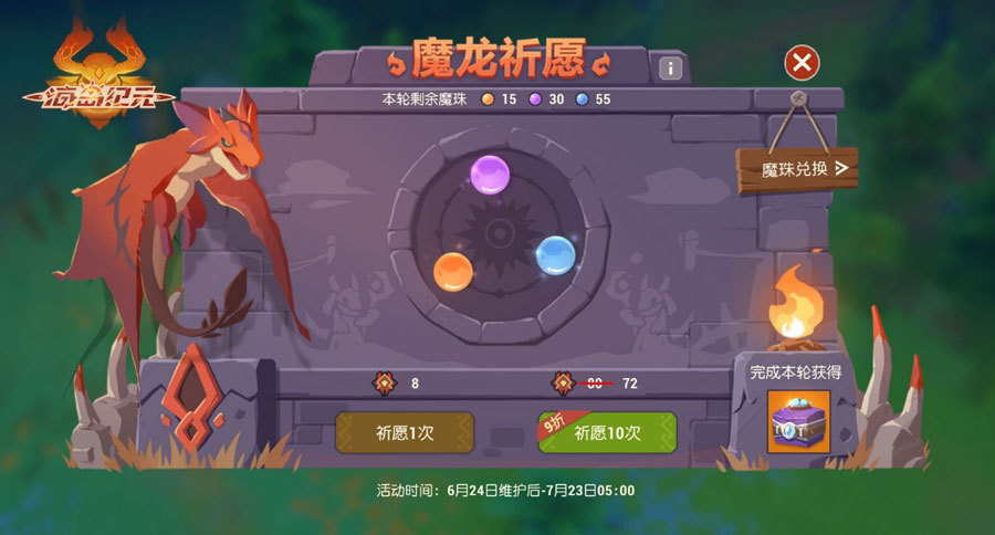 在【魔龙祈愿】转盘进行祈愿,可获得龙珠,兑换包括【龙族秘藏】在内的多种珍稀道具!完成整轮祈愿更可获得【商会的珍藏】,有机会开出【古代藏宝图】与【上古传承】装备!