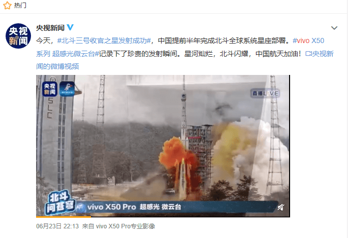 6月23日长征三号运载火箭成功将第55颗北斗导航卫星送入预定轨道,标志着我国北斗三号全球组网收官之星发射成功。在昨日央视的直播中有许多全新的拍摄角度!其中就有vivo新机X50 Pro近距离拍摄火箭起飞时震撼的画面。