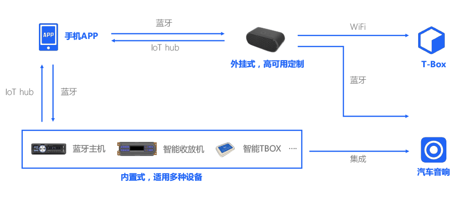 思必驰智能车联网方案为用户提供定制化手机APP,出行、工作、生活、娱乐内容作为可选配的模块,以软件形式嵌入车载场景中。支持安卓/IOS双系统,可为客户提供UI自定义服务。思必驰独有专利双蓝牙技术,满足设备与手机、车载同时连接的场景需求,其连接便捷稳定,性能远高于单蓝牙;各终端连接极其顺滑,极大程度提升最终用户使用体验。用户通过手机APP获取导航、音乐、电台、微信收发、通话、车家互动等基本服务,更有技能学习和自定义娱乐功能等待用户发掘。