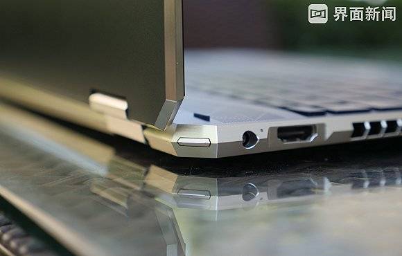 值得留意的细节是,Spectre x360 15可触控变形本的电源按键,内嵌在了笔记本左上角的边框内,同样采用了上下切割的造型,对应了整机的设计语言。而相比起常规的黑灰色搭配,摩卡黑金配色也为整机增添了质感。